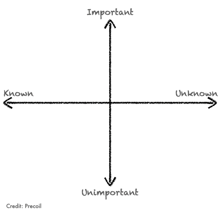 This 2×2 matrix is quite straightforward. Along the x-axis we have a continuum we have assumptions that range from very certain to very unknown. Assumptions that are well-known may not be proven exactly but you have very high confidence in their correctness.