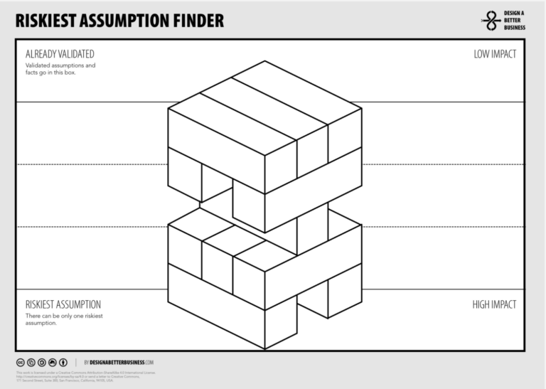 Riskiest Assumptions Canvas by designabetterbusiness.com. They provide some downloadable tools and step-by-step instructions for running an assumption workshop. I think their model over-simplifies the ranking but it can be useful for a quicker review of assumptions and provides a nice Jenga-like mental model.